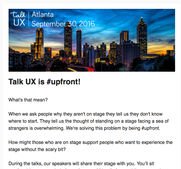 #upfront is continuing to grow and we are working closely with the ninety people who have sat #upfront since January. I'm dedicated to making the world more confident. We're running an #upfront workshop for women in London next month. Grab tickets here. This workshop in creative confidence and courage for the Service Design Fringe Festival is about helping service designers talk about who they are and why they do the work they do. Talk UX in Georgia, Atlanta will be an #upfront conference.