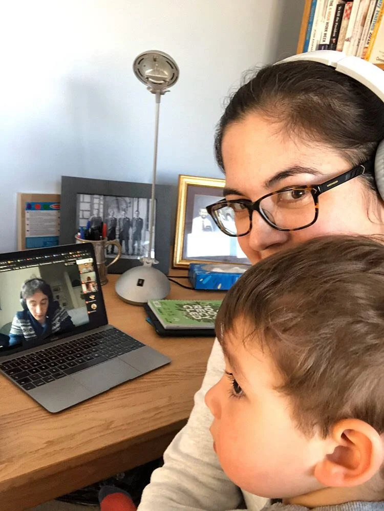 This is a picture of Nic who's a product lead for an energy company. Nic and her partner have two desks in two separate rooms, both working about 8.30 - 6 in the evening. They drive to pick their nanny up every morning and drop her home again in the evening. They've all been isolating for over 2 weeks.