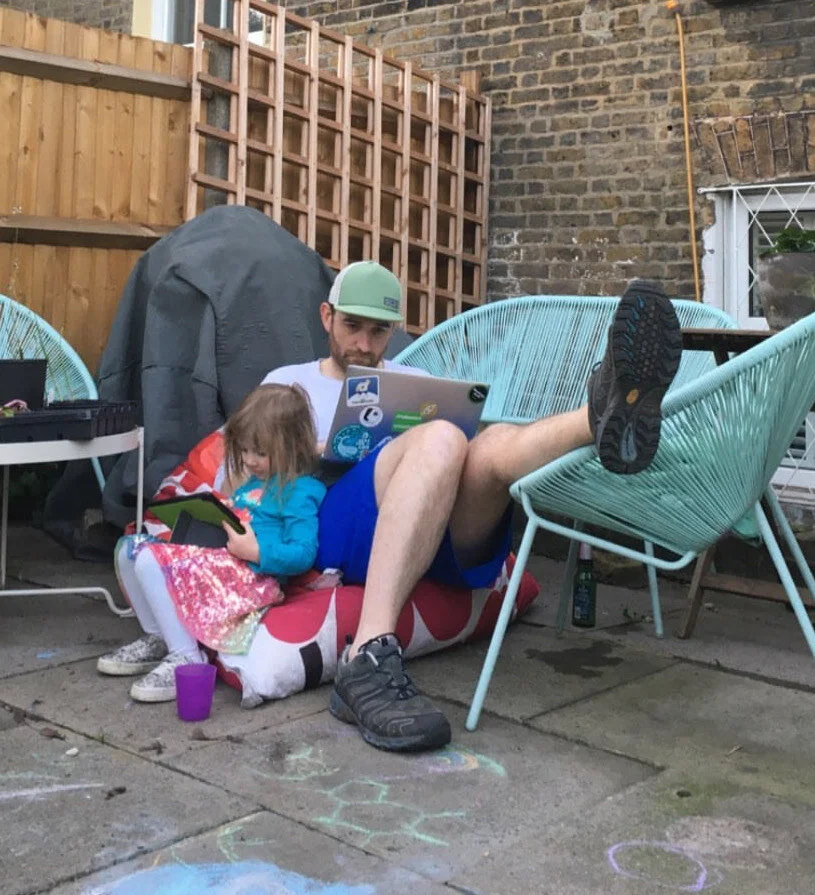 This is a picture of Liam, a senior data analyst who is tag-teaming with his partner Molly. When one of them is in meetings, the other spends time with their little girl but Molly has the most meetings so Liam is doing the lion's share.